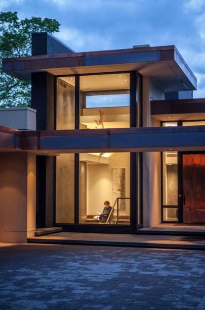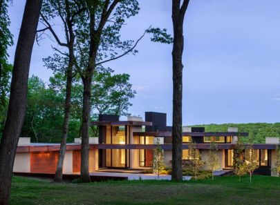 Дом в экостиле построен на склоне холма, и эта особенность нашла продолжение в многоступенчатой конструкции здания. Плоская крыша каждого из сегментов дома, словно ступеньки гигантской лестницы, самая высокая из которых акцентирует входную зону.