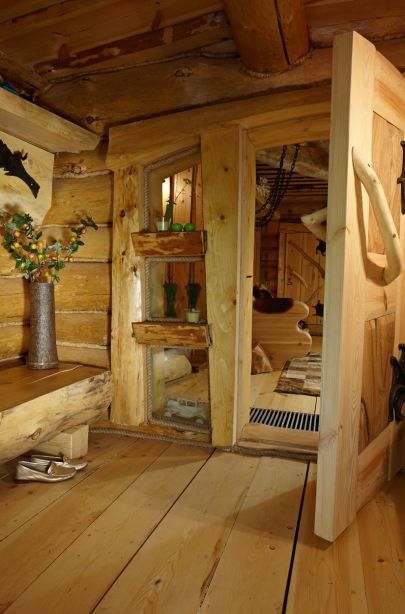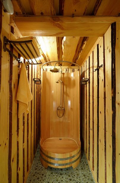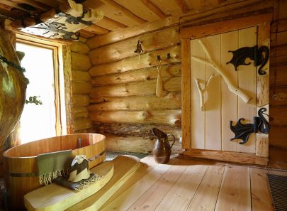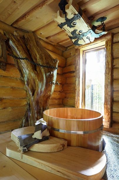 Круглая кадка-купель установлена перед оконным проемом, так что во время водных процедур можно любоваться природой. Подиум из сложенных досок поможет без усилий перешагивать высокий бортик. Ретро-краны вмонтированы в огромный древесный ствол.