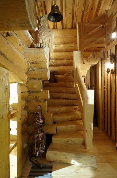 Реализованный интерьер деревянного дома из бревна обладает живой аурой природных материалов. Обстановка получилась практически монохромной, рельеф и визуальную насыщенность ей придают сама древесная фактура и объемные элементы дизайна. К тому же такой фон помогает помещениям с небольшими окнами стать светлее.
