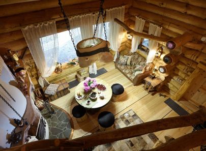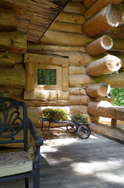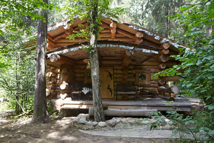 В экстерьере и внутренней отделке использованы исключительно природные материалы. Строение органично вписано в ландшафт, а дизайн интерьера внутри дома из бревна выполнен в самобытном эко-стиле. Благодаря инженерным решениям по отоплению, канализации, освещению находиться здесь можно круглый год. Отдыхать душой, наслаждаться птичьими трелями и игрой солнечного света на дикой смородине…