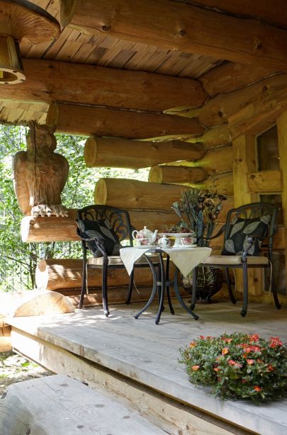 - Коттедж-изба имеет две открытые террасы. Со стороны заднего фасада – лаконичную по дизайну, со скамьей и столиком-колодой. Парадная площадка оснащена зоной отдыха и обеденной группой с черной кованой мебелью. Резная скульптура филина, цветочные горшки в садовой тележке, дверные петли в виде ящериц – каждая деталь тщательно продумана и смотрится совершенно естественно.