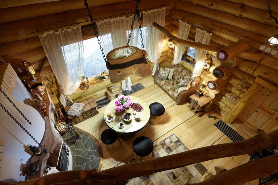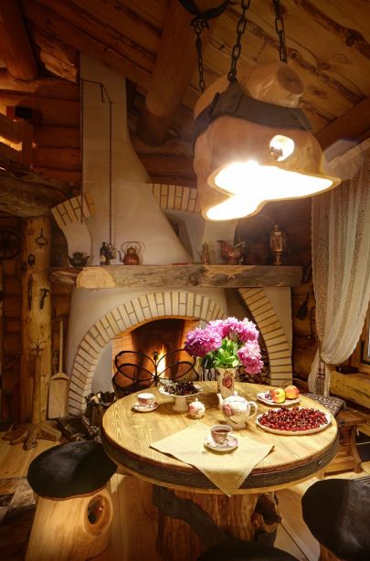 Внутри сруба и декор соответствующий: старинные чайники, ларцы, ключи, резные скульптуры. Коммуникации спроектированы таким образом, чтобы органично дополнять деревенский антураж и обеспечивать комфортное проживание здесь в любой сезон.
