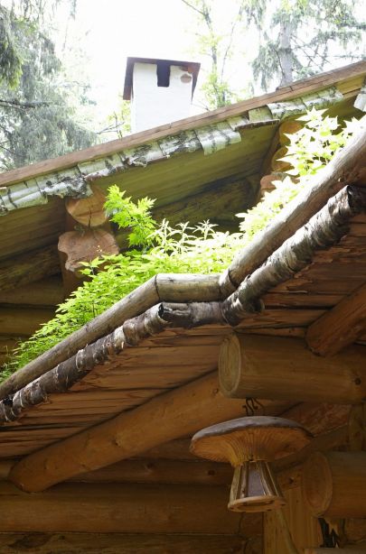 - Асимметричный силуэт избы подчеркивают выступающие из фасадов бревна, кособокие оконные и дверные проемы. Разумеется, все конструкции просчитаны с точки зрения надежности, практичности и теплообмена. Живописный облик продолжают коряги на карнизах, уличные фонари-грибы.