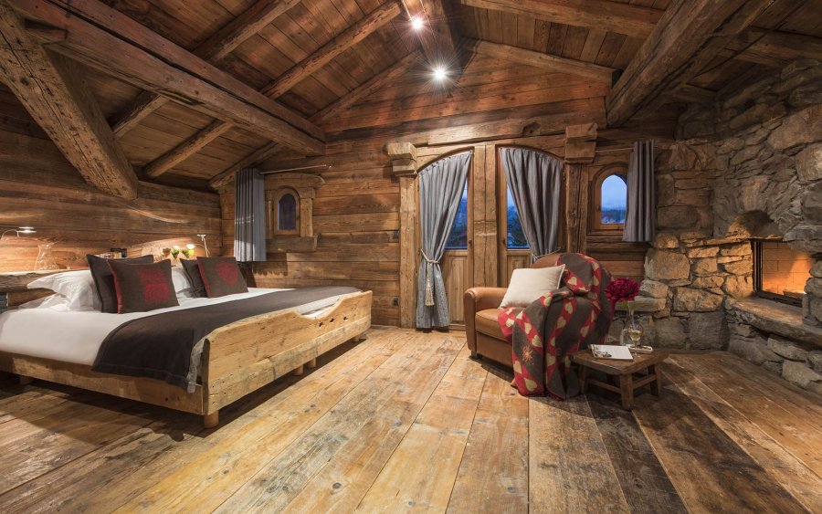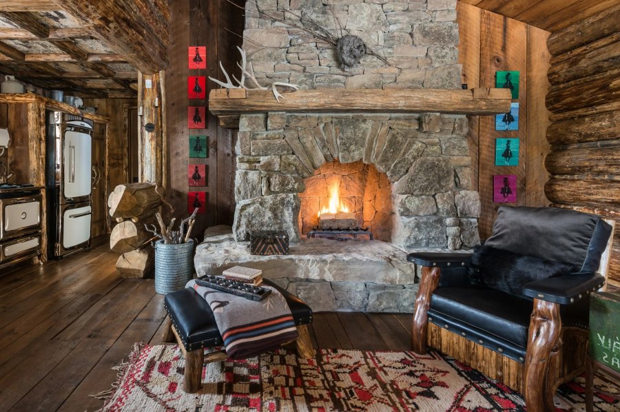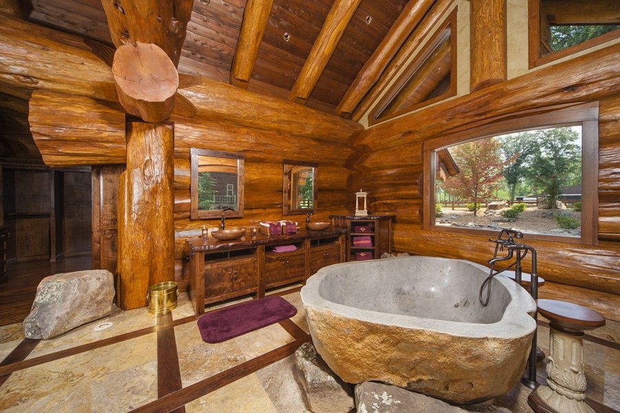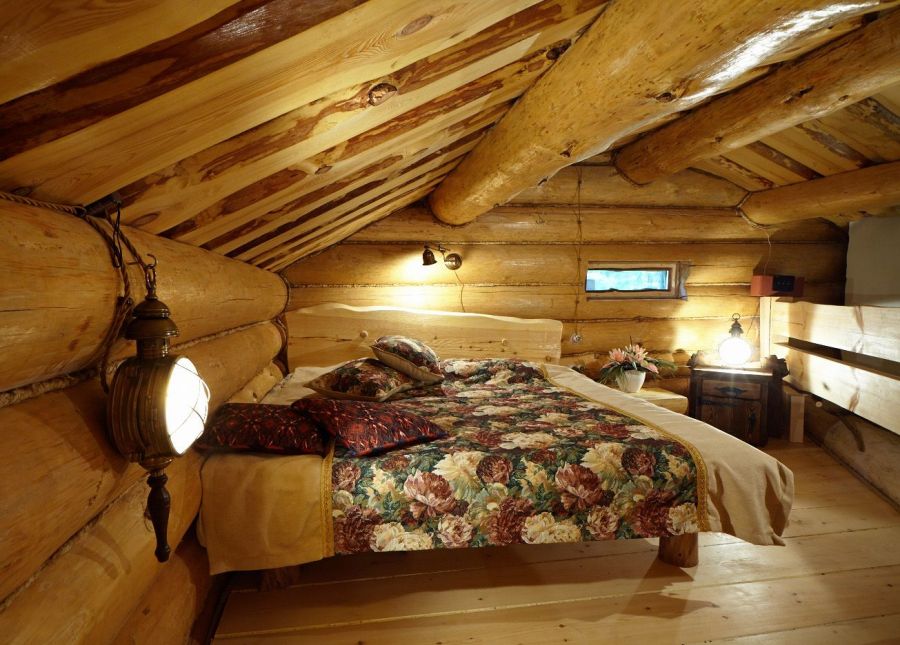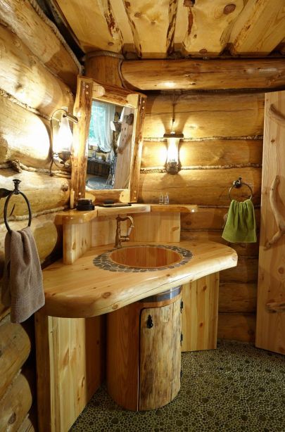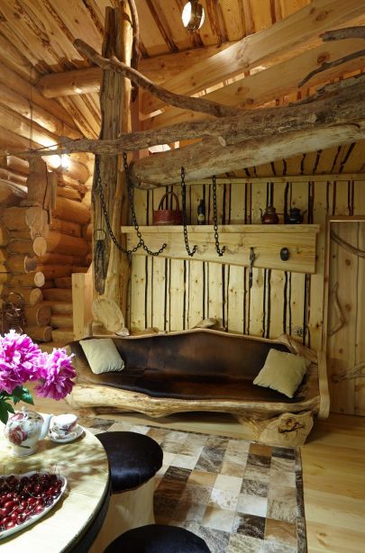 Основной отделочный материал – натуральная древесина с минимальной обработкой. Из нее изготовлены стенная обшивка, пол, мебель ручной работы, оконные рамы и двери, тяжеловесные потолочные балки. Сколы и трещины на поверхности не маскируются, а выставляются напоказ, подчеркивая природное происхождение. В типичном интерьере комнаты из бревен присутствует такой же необработанный камень, цветовая палитра подобрана в теплых землистых оттенках. Пни, ветки, корни работают средством декора.