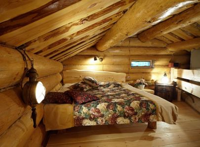 Почти все пространство занимает широкая двуспальная кровать в стиле рустик. Для освещения используются старинные лампы с витыми шнурами. Нависающие сверху мощные потолочные балки создают красивый декоративный акцент.