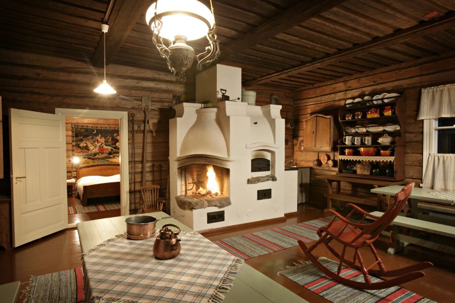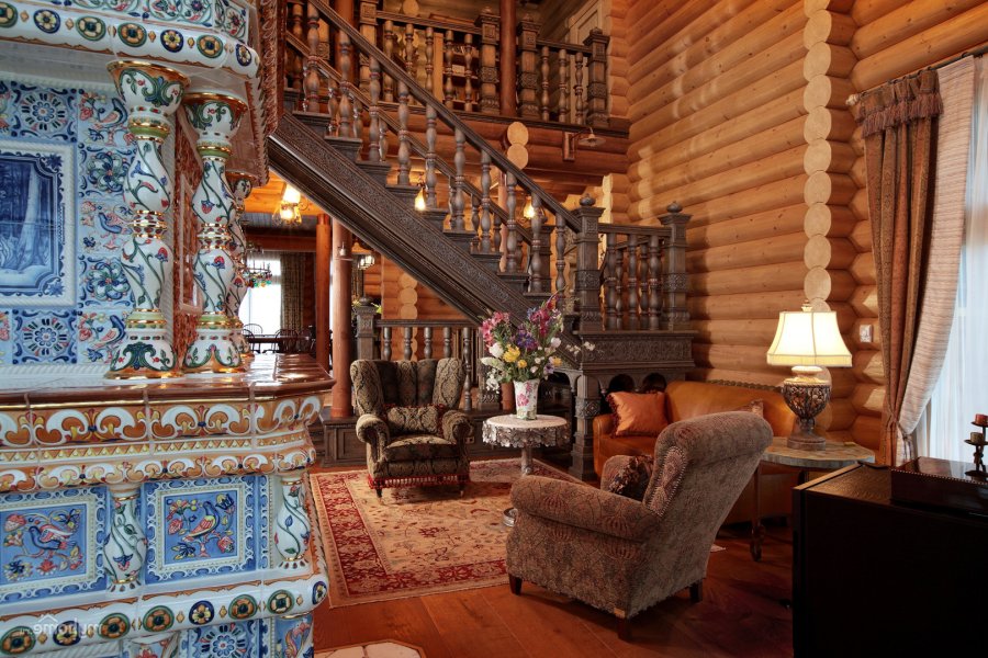 Второй вариант – русский терем – плотнее насыщен красочным декором, резными элементами, мебель тут более изящная. Печь оформляется богаче и живописнее – яркими расписными изразцами с глазурью.