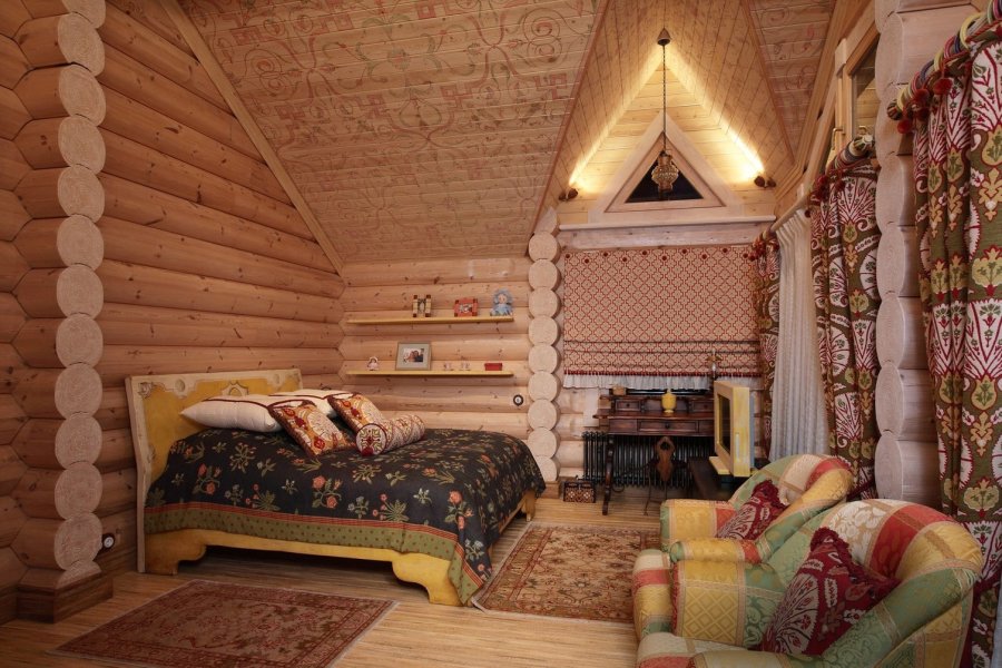 Этнический дизайн интерьера в бревенчатом доме можно реализовать в двух вариантах. Первый – стилизованная русская изба – предпочитает традиционное простое убранство сруба, с деревянной мебелью, сундуками в качестве систем хранения, лавками для сидения, стилизованной печью, красивыми орнаментами на поверхностях и текстиле.