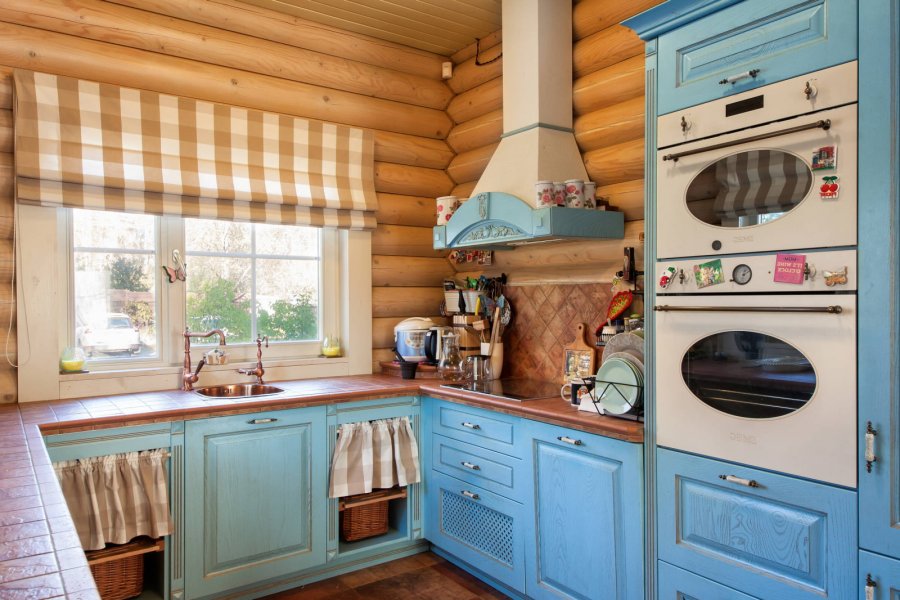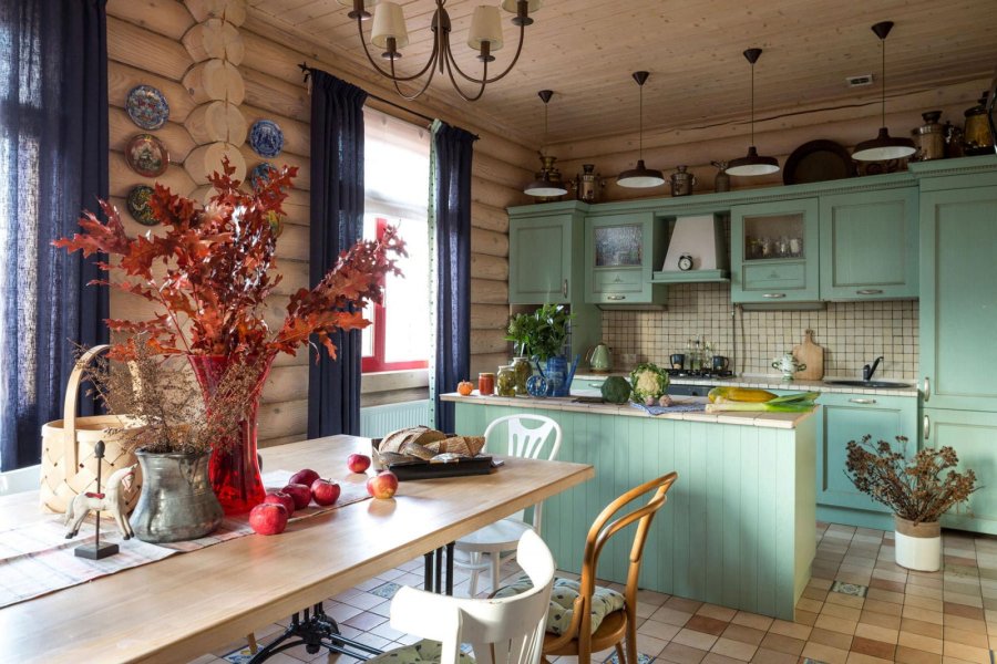 Для оформления кухни в бревенчатом доме стиля Прованс подбирают гарнитур из дерева с филенчатым дизайном. Приглушенные бирюзовые, лавандовые, салатовые оттенки фасадов выгодно сочетаются с рельефными стенами, плиточным полом, керамическим фартуком. Дополняют обстановку множество аксессуаров: вязаные салфетки, клетчатые и цветочные скатерти, шторы, мягкие подушки на обеденных стульях, плетеные корзины, винтажная посуда, расписные тарелки.