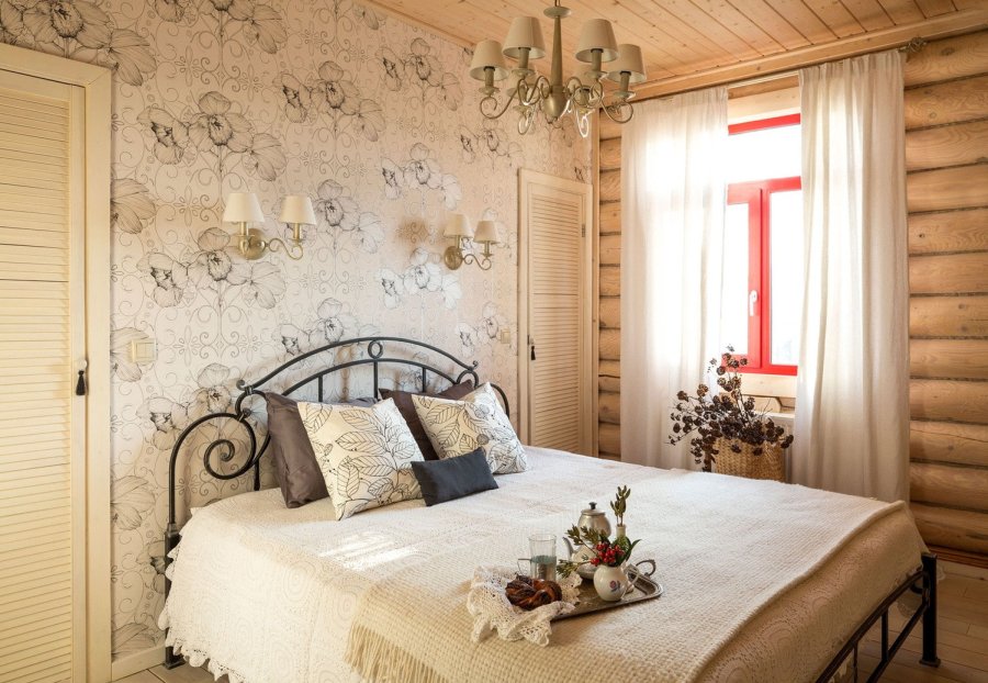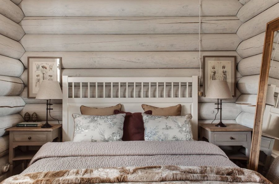 Романтический стиль французской деревни смягчает грубую эстетику сруба нежной пастельной гаммой и декором. Как и в предыдущем случае, древесина тонируется светлыми красками с сохранением природной фактуры. В отделке стен можно комбинировать оштукатуренные и окрашенные поверхности, обои.