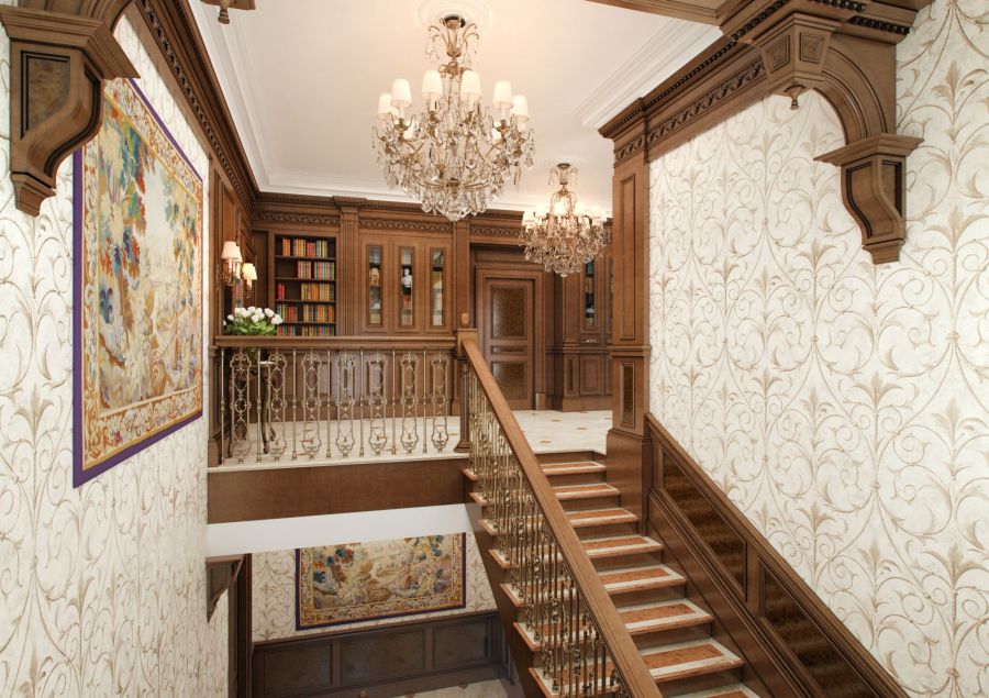 Величественность и роскошь прослеживаются в элитных классических интерьерах дома в п. Миллениум. Эстетический шок наступает при взгляде на огромную распашную лестницу, которая расположена сразу в вестибюле. Именно она – центральный элемент всей композиции, к которому стремятся диваны с двух сторон, узор на полу выполнен по направлению к ступеням.