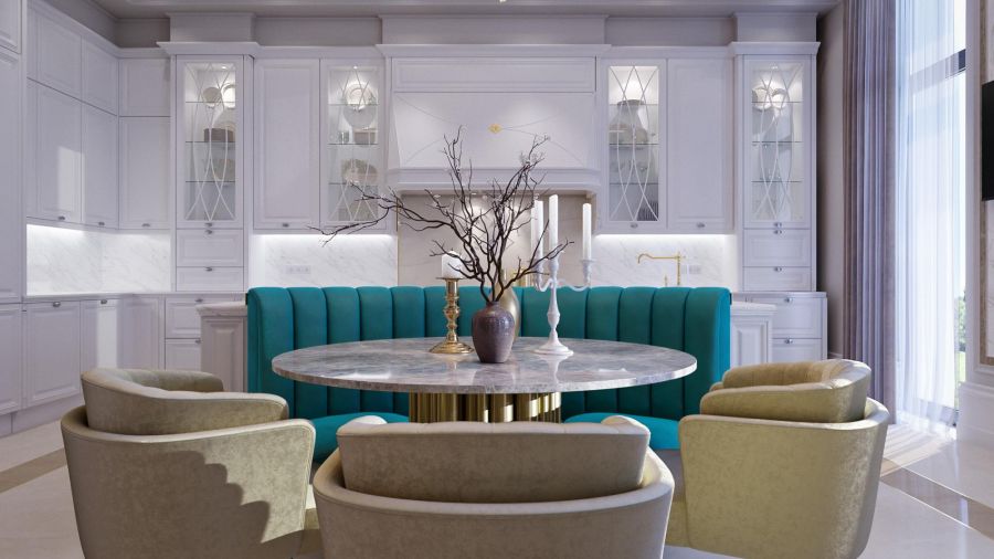 - Зонирование при помощи декоративных мини-колонн, молдингов – разделение на обеденную зону и отдельно расположенную группу кресел в стиле «честерфилд».