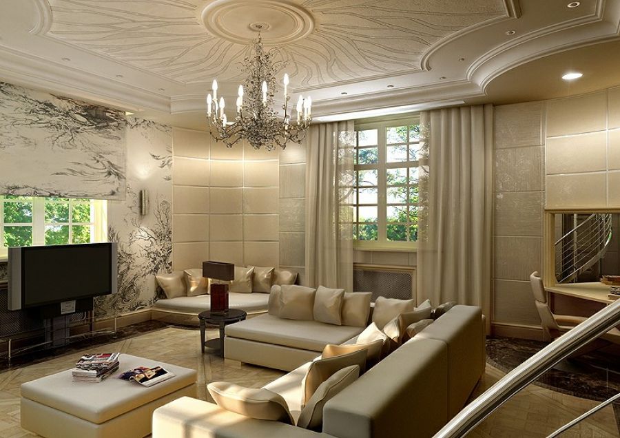 Среди использованных принципов из классического дизайна на примере бежевого интерьера частного дома: