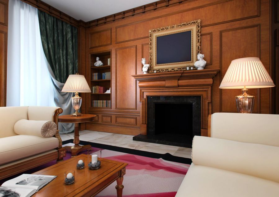 - Панели буазери. Ими оформлены стены, дверные проемы, камин.