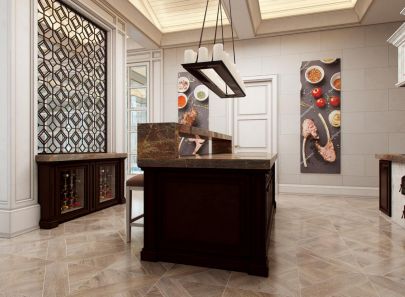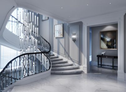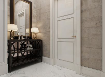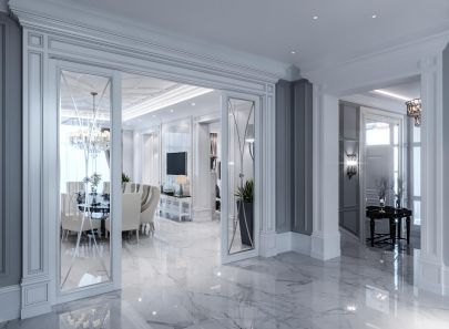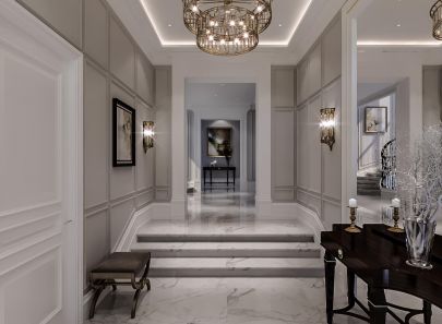 Гармоничен переход стен в потолок вестибюля, они образуют купол – также один из главных архитектурных элементов в классике. Поддерживается единая цветовая гамма в вестибюле и гостиной – пастельные оттенки дополняются более темными. Пол выполнен из глянцевого мрамора.