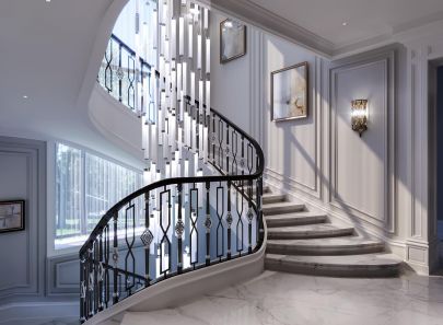 Величественность и роскошь прослеживаются в элитных классических интерьерах дома в п. Миллениум. Эстетический шок наступает при взгляде на огромную распашную лестницу, которая расположена сразу в вестибюле. Именно она – центральный элемент всей композиции, к которому стремятся диваны с двух сторон, узор на полу выполнен по направлению к ступеням.