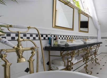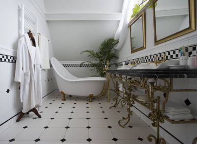 Ванная комната отделана белой плиткой метлахской раскладкой. На стенах ее ограничивает бордюр с шахматным рисунком. Белоснежная сантехника в ретро стиле отлично гармонирует с кованым ажурным подстольем, багетами зеркал. Для удобства хозяев обустроены две умывальные зоны, раковины встроены в длинную столешницу из черного мрамора.