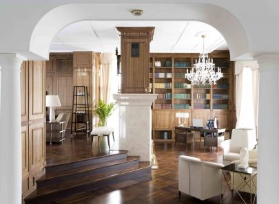 Стены обшиты деревянными панелями, пол отделан тонированной доской с поперечной выкладкой. Красивый контраст темному дереву дает молочно-белый цвет обивки диванов, потолка, облицовки камина, штор с жесткими ламбрекенами. Благодаря прозрачному сквозному окну биокамина, за пламенем можно наблюдать из любого места гостиной.