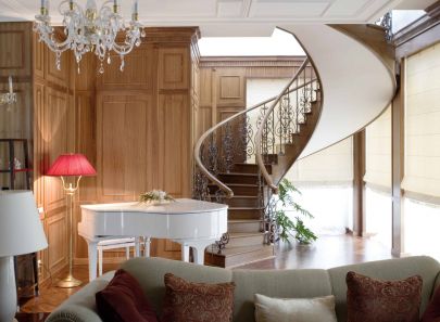 Гостиная имеет два разнофункциональных уровня, разделенные перегородкой с камином. На нижнем уровне обустроено место для отдыха перед камином (обтянутое коричневой кожей кресло и пуф), у стены высокий книжный шкаф и небольшое рабочее место с письменным столом (зона кабинета). Справа и слева от камина идет подъем из трех ступенек на уровень выше, здесь располагается диванная группа, белоснежный рояль, спиральная лестница на второй этаж.
