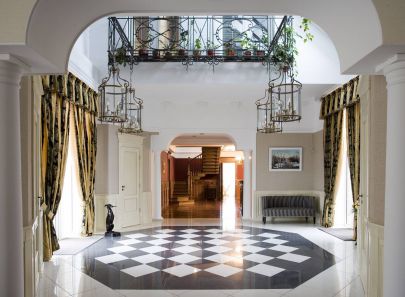 Пространство холла многоугольное, его контуры передает октагон, выложенный на полу шахматной плиткой. Стены обшиты буазери цвета топленого молока (выходящие в холл межкомнатные двери выполнены из того же дерева), выше – обои теплого серого оттенка.
