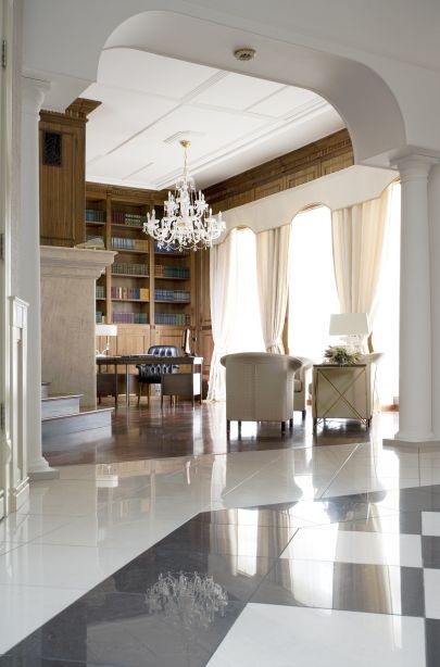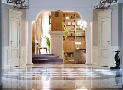 Из холла ведут два широких прохода в гостиную и столовую, оформленные арками и колоннами.