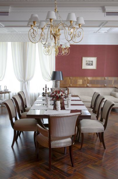Стены столовой окрашены в благородный цвет красного вина и отделаны буазери (деревянными панелями). В центре обеденный стол из темного дерева, полосатая обивка обеденных стульев создает 3D эффект и кажется рифленой. Такая же ребристая поверхность у комода. У стены расположилась барная стойка, также обшитая деревом.
