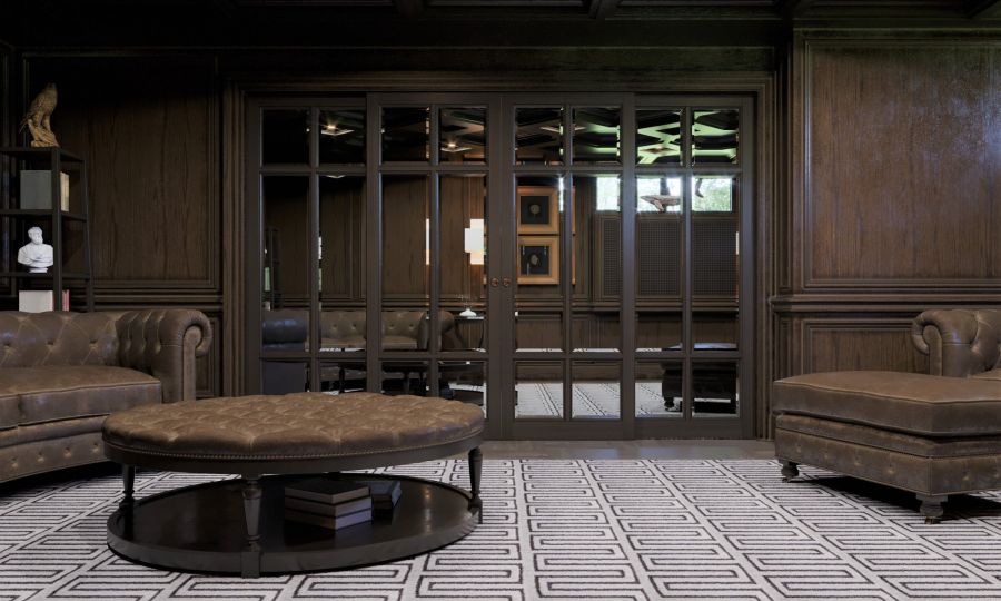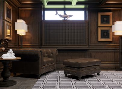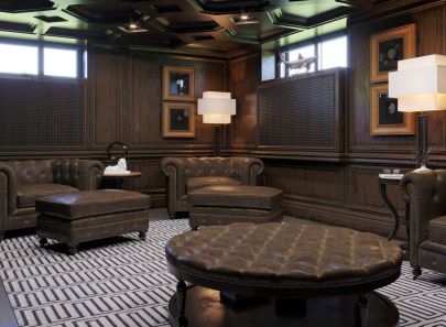 Дизайн сигарной фокусируется на цвете, текстуре и комфорте. Идеальное место вызывает в воображении образы дорогой тёмной кожи, ароматы выдержанного коньяка, ценную древесину с потемневшим благородным лаком.