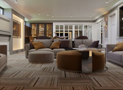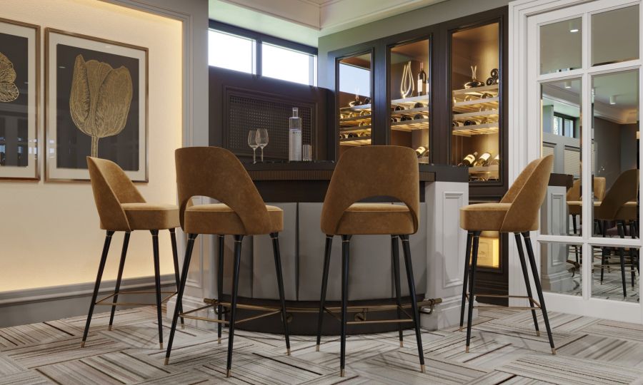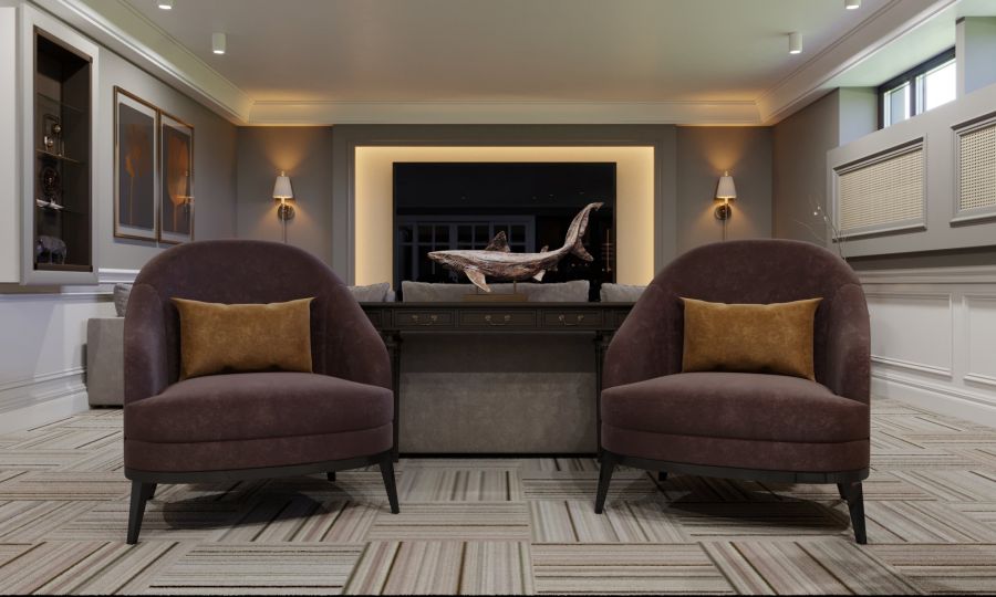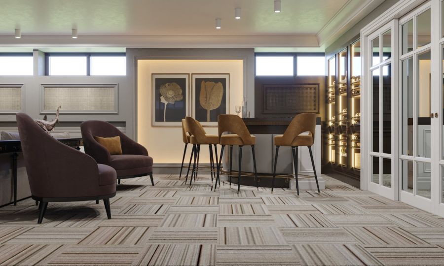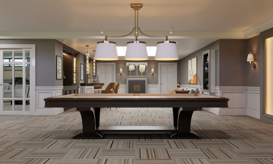 Обратите внимание, как открытое пространство уходит от жёстких рамок прямоугольника, предлагая посетителям уютные уголки в общей бильярдной комнате. Здесь будет комфортно и игрокам, и отдыхающим.