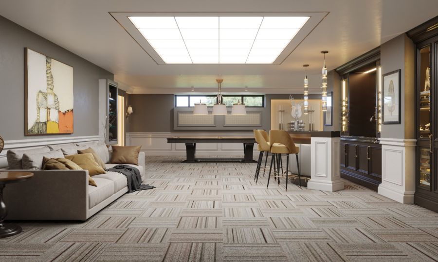 Цокольный этаж ассоциируется с замкнутым подземельем и нависающим перекрытием. Какого уюта и тепла можно ждать от такой комнаты? Но если над вами небо (искусственный мягкий свет по всей площади потолка), то пространство меняется. Шикарная бильярдная с баром, представленная на фото, показывает, что можно сделать с вспомогательным помещением, используя нестандартный подход.