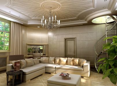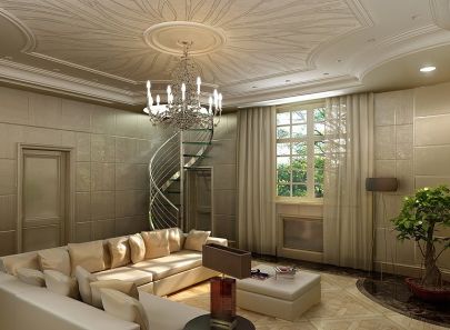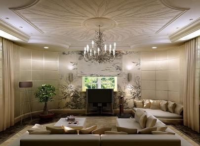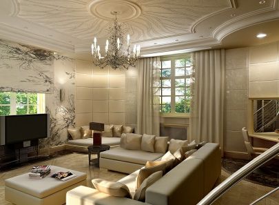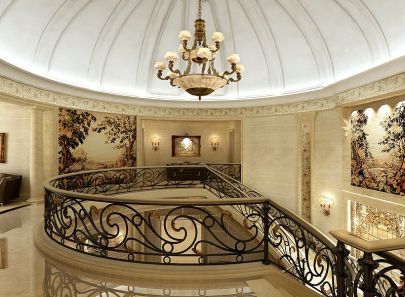 Стены второго этажа украшают фрески, карнизные барельефы, на входе в зону отдыха – колонны. Фреской (как вариант – масштабным гобеленом) и витражным панно отделана и центральная часть стены, к которой обращена лестница.