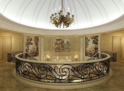 На полу зону ступеней подчеркивает рисунок глянцевого мрамора (в другом варианте дизайна это место выделено розеткой-мозаикой с цветочным орнаментом). Радиальное расположение несущих стен продолжено куполом кровли.