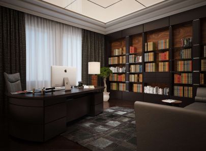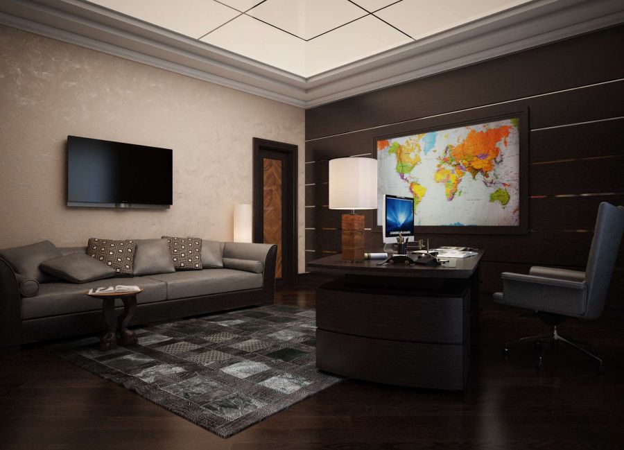 В отделке рабочей комнаты преобладает темное дерево напольного покрытия, книжных шкафов, письменного стола. Роль нейтрального серого цвета-компаньона играют кожаный диван, рабочее кресло, ковер с гламурным эффектом потертости. Функцию яркого декоративного пятна выполняет цветная карта мира в багетном обрамлении. В зависимости от нужной степени насыщенности обстановки стена под картой может быть отделана светлой венецианской штукатуркой или обшита темными деревянными панелями.