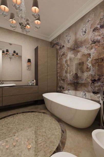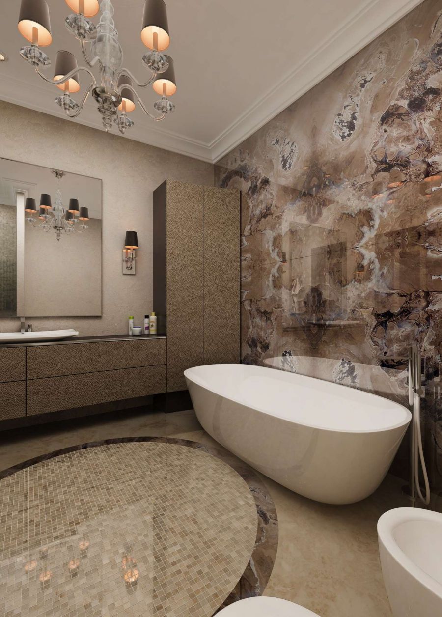 Дизайн ванной комнаты выстроен в однотонной стилистике, что делает помещение очень уютным, располагающим к отдыху. Как и в случае со спальней, обстановку оживляют текстуры: имитация мраморного слэба над купелью, мозаичный пол, шероховатые мебельные фасады.