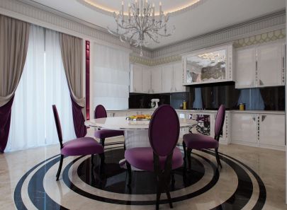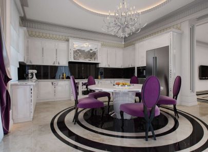 Аналогичные декораторские решения использованы в спокойном интерьере кухни, подчеркивая планировочную связь с общим пространством. Логический центр составляет обеденная группа из белоснежного круглого стола и стульев с лиловой обивкой. Ее композицию поддерживают концентрические круги напольного покрытия и потолочная круглая ниша с подсветкой.