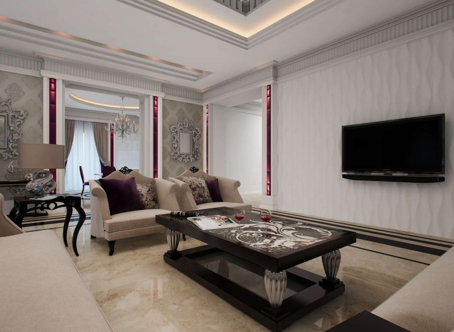 Бежевая диванная группа в зоне отдыха компонуется вокруг массивного журнального столика с инкрустацией. Стена с телевизором выделена нарядной белой отделкой с волнистым рельефом. Спокойный интерьер гостиной создают теплые серые оттенки классических обоев, белый потолок с переходящими на стены лепными фризами, мягкая мебель со светло-бежевой обивкой, окрашенные в серебро резные рамы зеркал. Глянцевое напольное покрытие под мрамор с контрастным темно-коричневым орнаментом стилистически связывает место отдыха со столовой зоной.