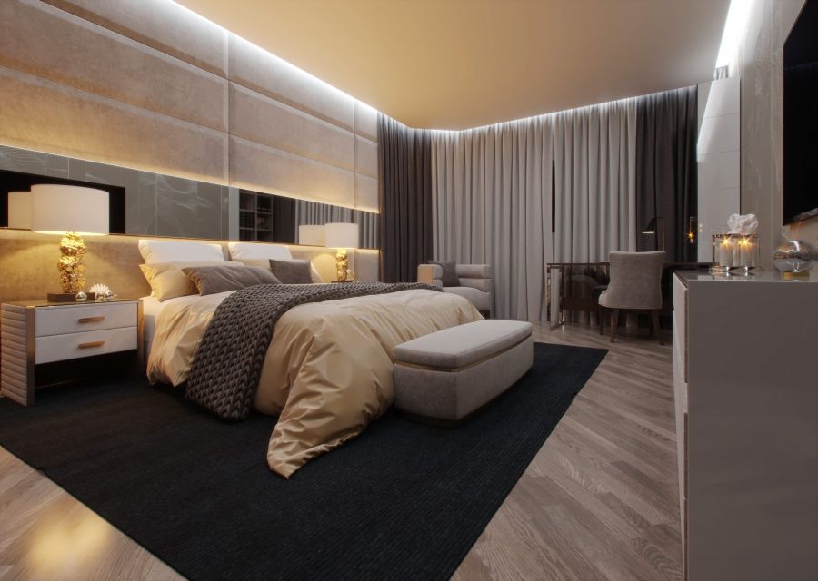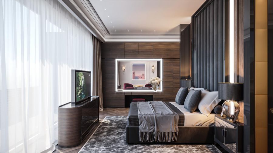 В сдержанном оформлении спальни преобладают оттенки беж, слоновой кости, мокко. Главный акцент сделан на роскошной меблировке. Двуспальная кровать украшена большим фигурным изголовьем с каретной стяжкой. В изножье установлена банкетка со спиральными валиками-опорами. В практически монохромную обстановку вносят разнообразие шторы с геометрическим рисунком и фактурный длинноворсовый ковер.
