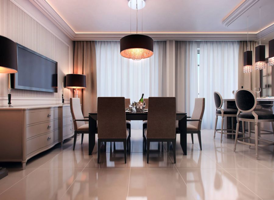 В умиротворяющем дизайне гостиной-столовой органично расставлены цветовые акценты – вкрапления благородного фиолетового оттенка в виде вертикальных настенных вставок, диванных подушек, двусторонних бежево-пурпурных портьер на высоких окнах.