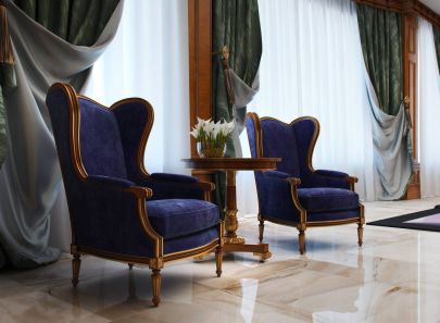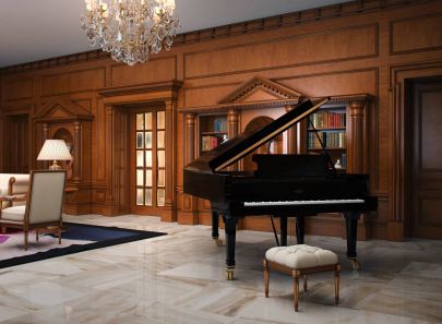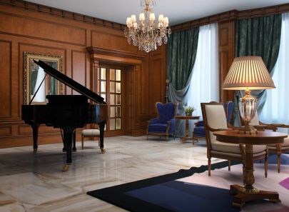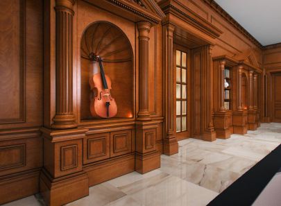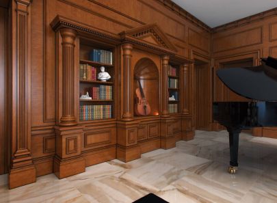 Основной элемент отделки – стеновые деревянные панели буазери – выступают благородным обрамлением классического интерьера. В едином стиле выполнена обшивка стен в гостиной, дверные проемы, портал камина, встроенные книжные полки. По обеим сторонам от главного входа расположены античные ансамбли с центральной полусферической нишей для скрипки.