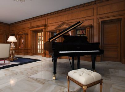 Гостиная прекрасно совмещает функцию презентационной зоны, места для отдыха и музыкального салона. Черная, как смоль, лакированная поверхность пианино в интерьере колористически рифмуется с контрастной окантовкой роскошного напольного ковра.