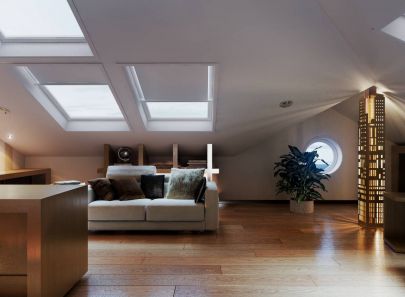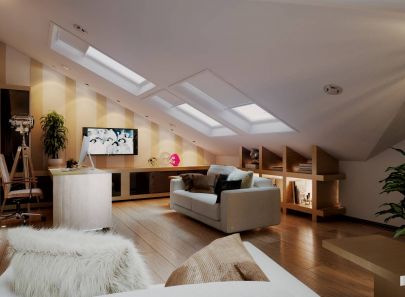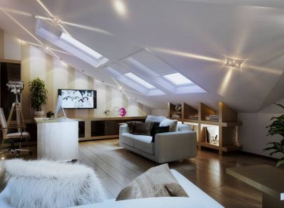 Пол выложен паркетной доской, полосатые обои на одной из стен поддерживают его цветовую гамму пола. Мансардные окна оборудованы белыми в тон потолка ролл-ставнями с дистанционным управлением. На перекрестье кровельных скатов разместился напольный светильник, который напоминает ночной небоскреб. Свет от него интересно преломляется на потолочных плоскостях.