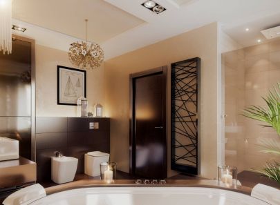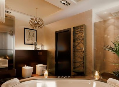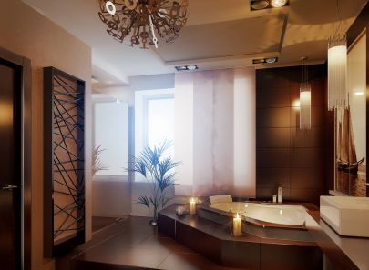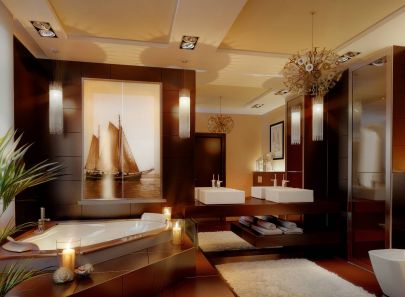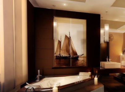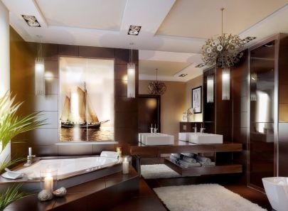В интерьере комнаты также доминируют коричневые цвета: пол, стены и подиум ванны облицованы плиткой. Стену над ванной украшает фотопанно в режиме сепия с изображением парусника. На красивом контрасте с темной фактурой стена во входной зоне отделана влагостойкой перламутровой штукатуркой. Зона умывальников оформлена зеркальным полотном, дизайн кубических раковин продолжает концепцию прямолинейной геометрии. На одном уровне с купелью, чуть выше основного уровня пола, располагается ниша с душем, отгороженная прозрачными перегородками.