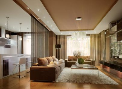 Диванную группу составляют два светло-коричневых дивана со спинками-подушками. Перед ними журнальный столик на прямых металлических ножках и столешницей под мрамор. Под ногами пушистый светло-бежевый ковер. Центральная часть подвесного потолка также окрашена в теплый коричневый оттенок, по периметру оставленного белым короба встроена точечная подсветка. Основной светильник – люстра с фантазийным абажуром.