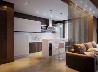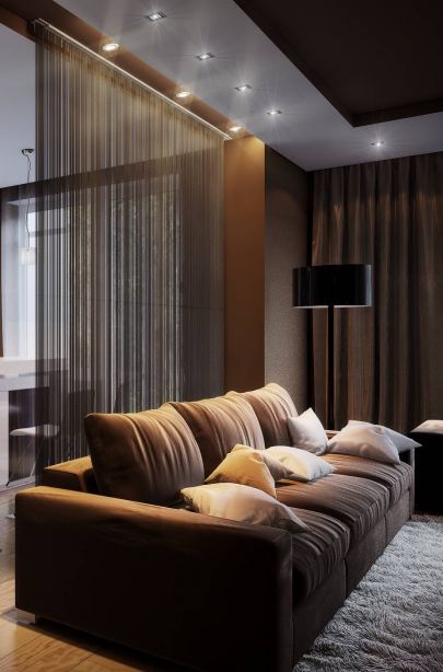 Декоративная штора-перегородка из множества коричневых нитей, подвешенная за спинкой дивана, условно отделяет место отдыха от кухни.