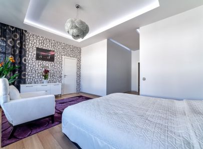 Для ремонта спальни в новом доме и примыкающей к ней туалетной комнаты выбрана спокойная серая гамма.