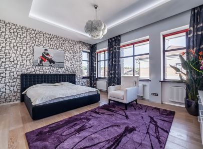 Получилась просторной, здесь размещена круглая ванна на подиуме. Пол, подиум и основание для дивана отделаны деревом с подчеркнутой фактурой.