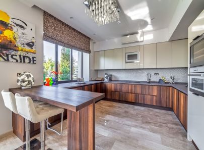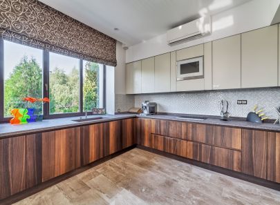 Просторный светлый холл раскрашен в яркие цвета живыми растениями и картинами. Входная дверь оформлена молдингом, повторяющим ее контур. Стена в этом месте окрашена в серо-коричневый оттенок. Таким же цветовым акцентом выделена стена, за которой расположена кухня, а также стена в гостиной.