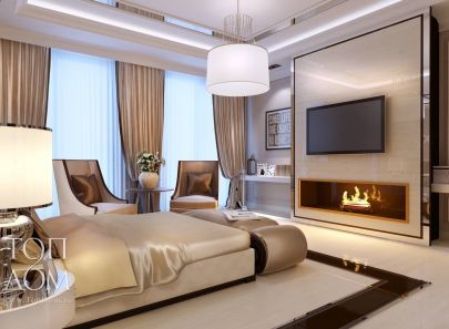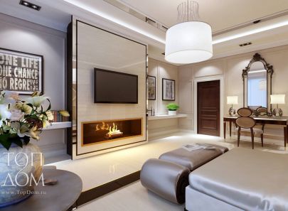 Холодную минималистскую нотку во все это великолепие вносят зеркальные вставки по контуру зоны изголовья, продолженные в глянцевой темно-коричневой плитке на полу, зеркальное обрамление в зоне ТВ и на потолочной нише.