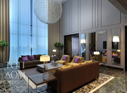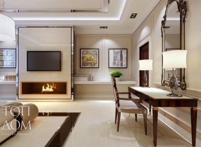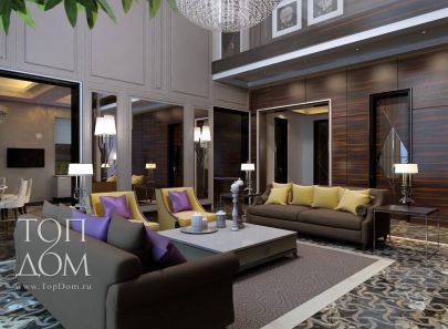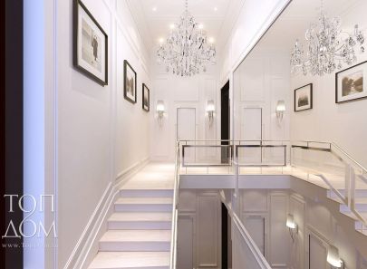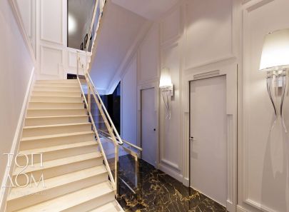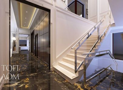 Интерьер большого дома отличается обилием зрительно холодной фактуры (плитки с разнообразной текстурой мрамора) и обращением к довольно неоднозначному в плане восприятия зебрано в отделке. Эффект от этих материалов уравновешивают классические приемы декора, которые вносят в дизайн изящество и симметрию.