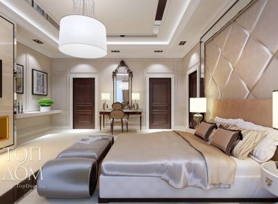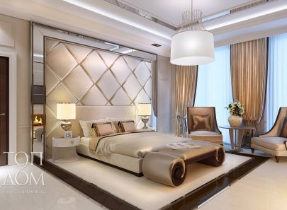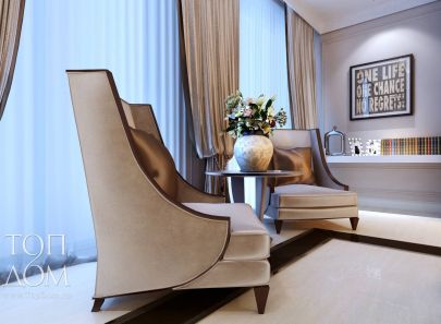 Дизайн спальни – торжество атласной фактуры, мягкости и очень нежных кремовых оттенков. Стена за изголовьем из объемных панелей, обивка банкетки и кресел, покрывало, шторы – все переливается перламутром. В дизайне мебели преобладают плавные, округлые формы (прикроватные тумбочки, опоры-завитки банкетки). Подлокотники кресел, плавно выходящие из спинки, напоминают лепестки цветка.