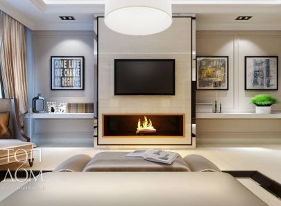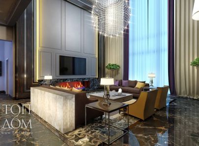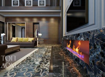 Мощный цветовой акцент помещению задают пол и стены. Пол облицован глянцевой плиткой под мрамор. Ярко выраженная структура материала, темный графитовый фон с контрастными светло-серыми прожилками создают очень активную колористическую основу для интерьера. Зона диванной группы, расположенная в центре, выделена еще более пестрым рисунком мрамора – с повторяющимся узором. Концентрированным воплощением серой гаммы стал ковер под кофейным столиком. На стыке со стеной в зоне камина, мраморный пол переходит в чернильные и синие оттенки облицовки. За счет глянцевого покрытия в напольной плитке отражается вся комната, особенно, когда включены светильники. Этот прием позволит избежать мрачного ощущения от доминирующих в отделке темных поверхностей.