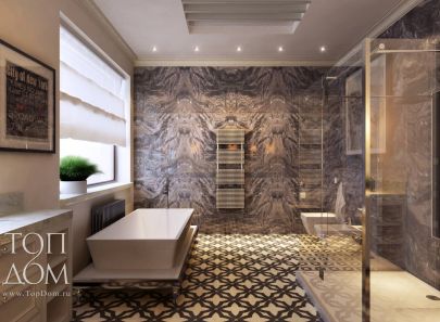 В интерьере ванной микс из классических фактур и минималистских форм достигает апогея в дизайне купели: прямоугольный скошенный книзу корпус покоится на основании с очень характерными фигурными ножками. Стены облицованы плиткой с опять же активным мраморным рисунком, пол – пестрой керамикой с графичным орнаментом.